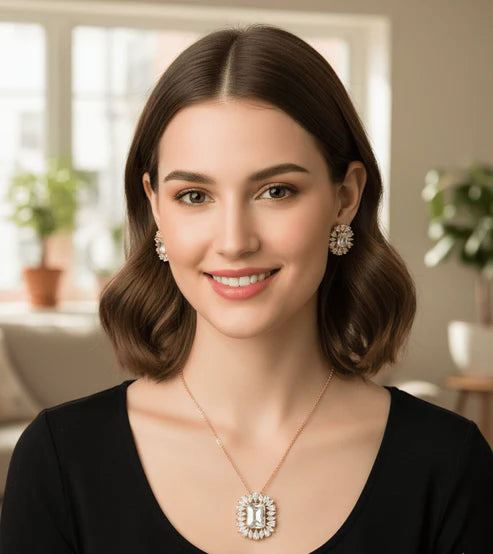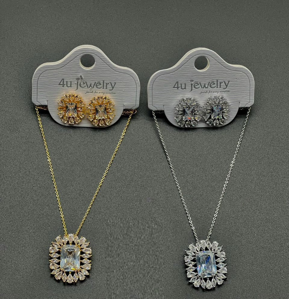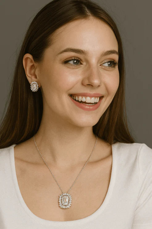 This is a Emerald Radiant Halo Set by 4U Jewelry. The set exudes timeless elegance with its large rectangular center crystal surrounded by a halo of finely cut stones. Available in Gold and Silver tones, it’s designed to add a luxurious sparkle to both formal and festive outfits — perfect for weddings, parties, or elegant evening wear.